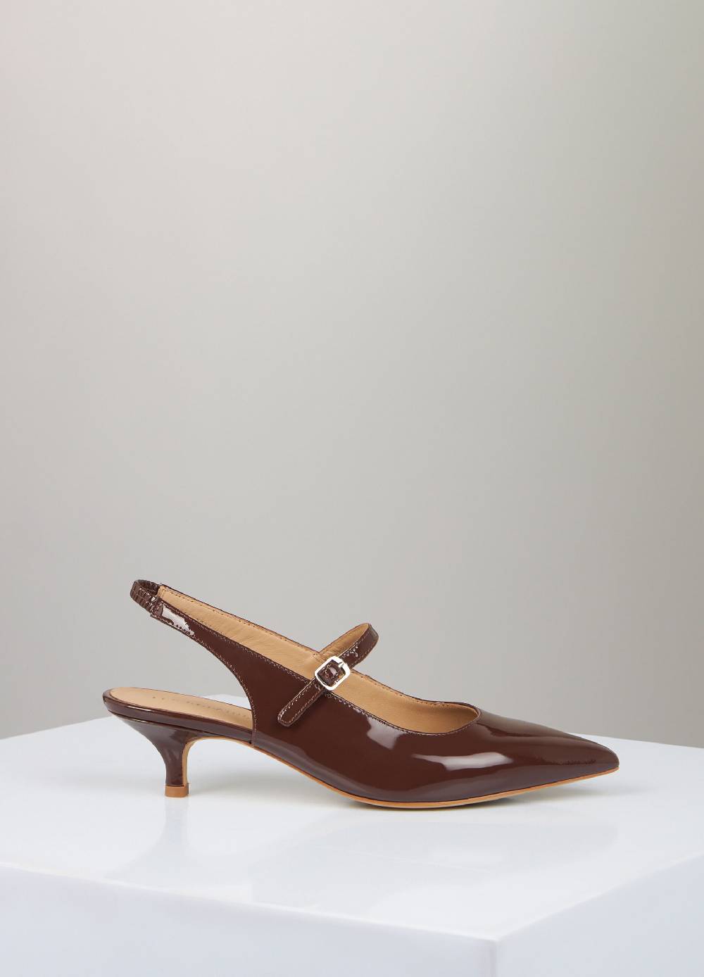 Décolleté viola in vera pelle, esaltate dalla finitura verniciata. Tacco basso e cinturino alla caviglia.