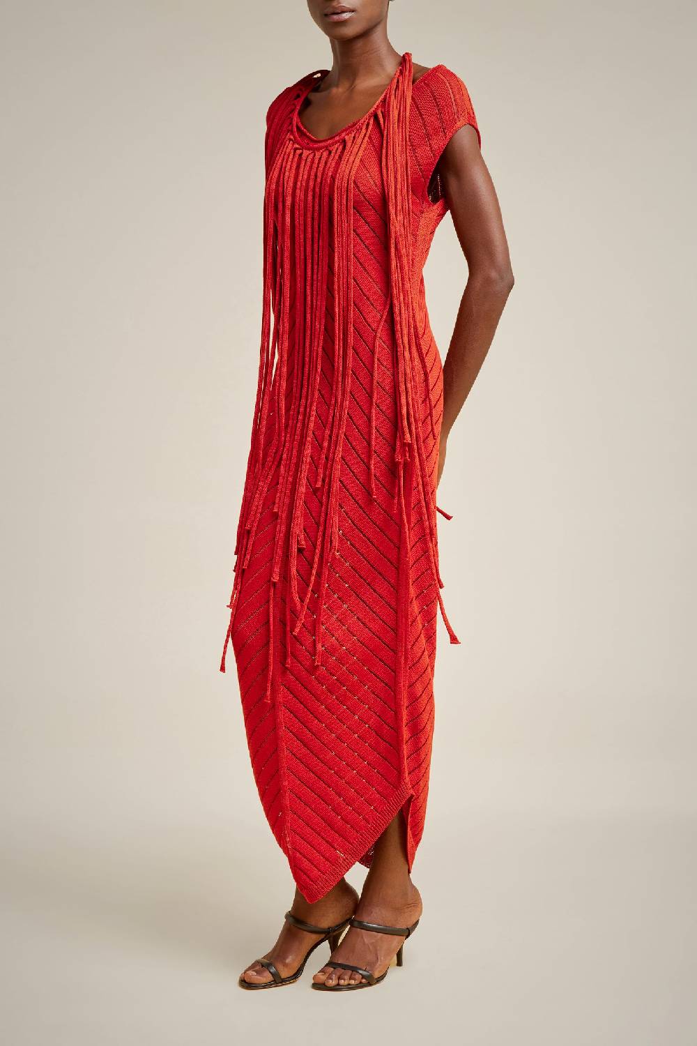 Abito lungo in cotone lucido, scollo a v, giromanica, modello dritto con orlo asimmetrico.