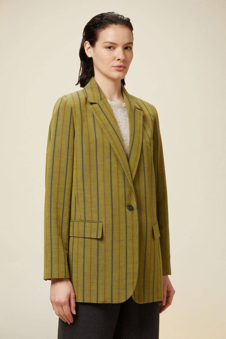 Giacca semifoderata in tela di cotone e lino rigata. Chiusura monopetto ad un bottone, collo a revers, due tasche a filetto con pattina e taschino laterale a filetto sul petto, spacco posteriore centrale. La modella indossa la tg. IT 40