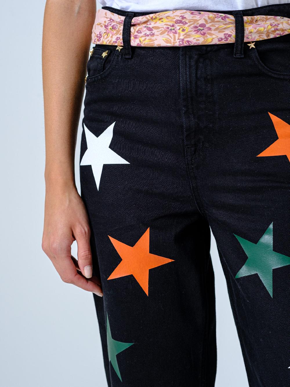 Cinque tasche high fit, vita alta, bottoneria gioiello. Drill di cotone. Logo Rossano Perini. Made in italy.Tinto nero. Applicazione stelle di vari colori (terracotta, verde scuro, glitter oro, marrone, ghiaccio).Fondo tagliato a vivo.Pantalone con bandana su cinturone.